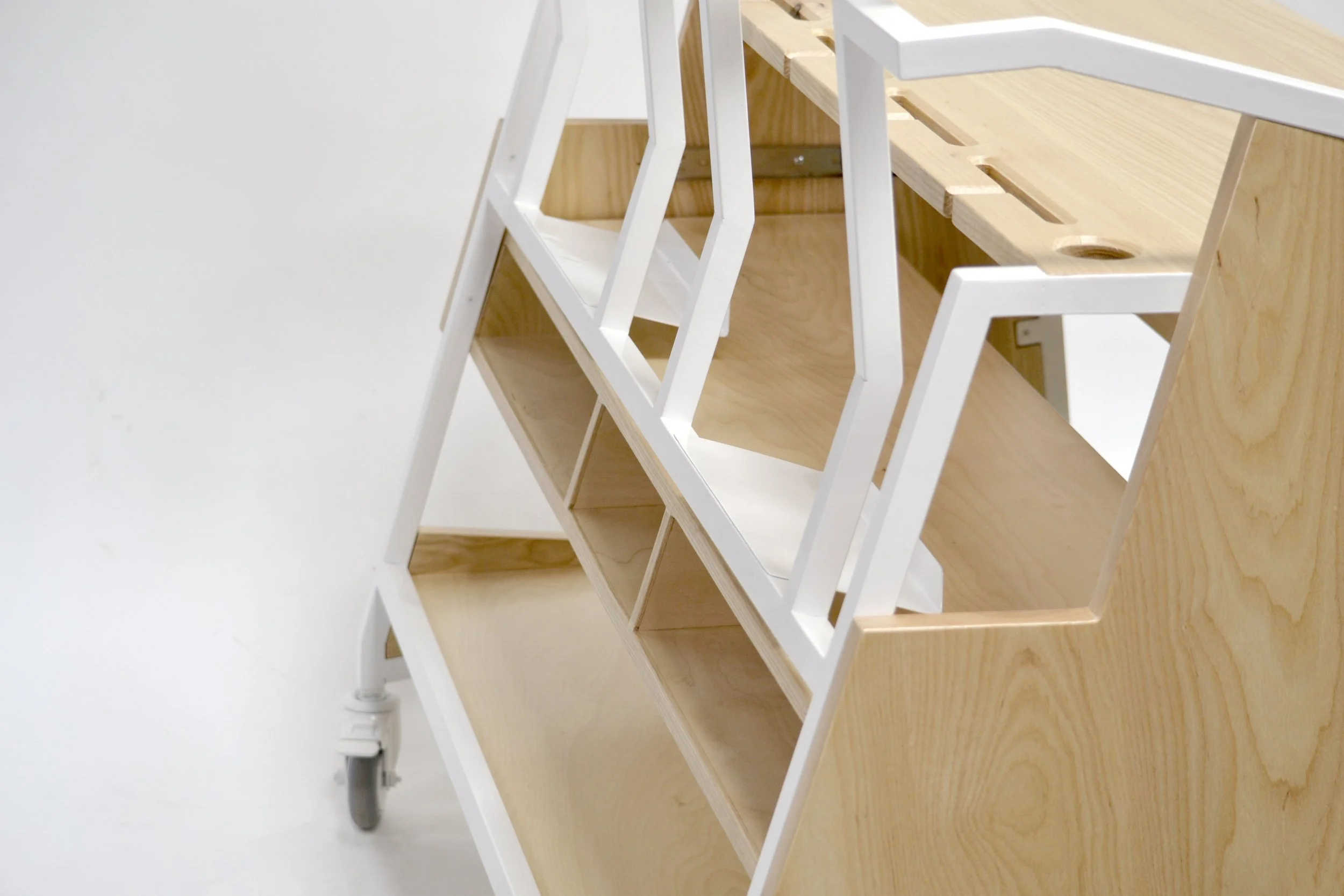 This station was designed around the concept of a musician workbench. The top “claws” receive euro racks for synths while the generous “deck” allows for swapping extra synths, keyboards, pedals…. Patch bays, power unit, storage and cable management complete this do it all workstation.